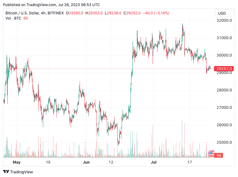 Pada saat laporan ini ditulis, harga Bitcoin masih berada di level $ 29,257. Bitcoin terkoreksi setelah sebelumnya sempat menduduki harga di atas $ 31 ribu. Peregrakan Bitcoin saat ini masih berada dalam zona distribusi. Di mana fase ini adalah ketika para pemegang aset atau investor yang sudah membeli dalam fase akumulasi cenderung mulai menjual posisi mereka untuk mengambil keuntungan.