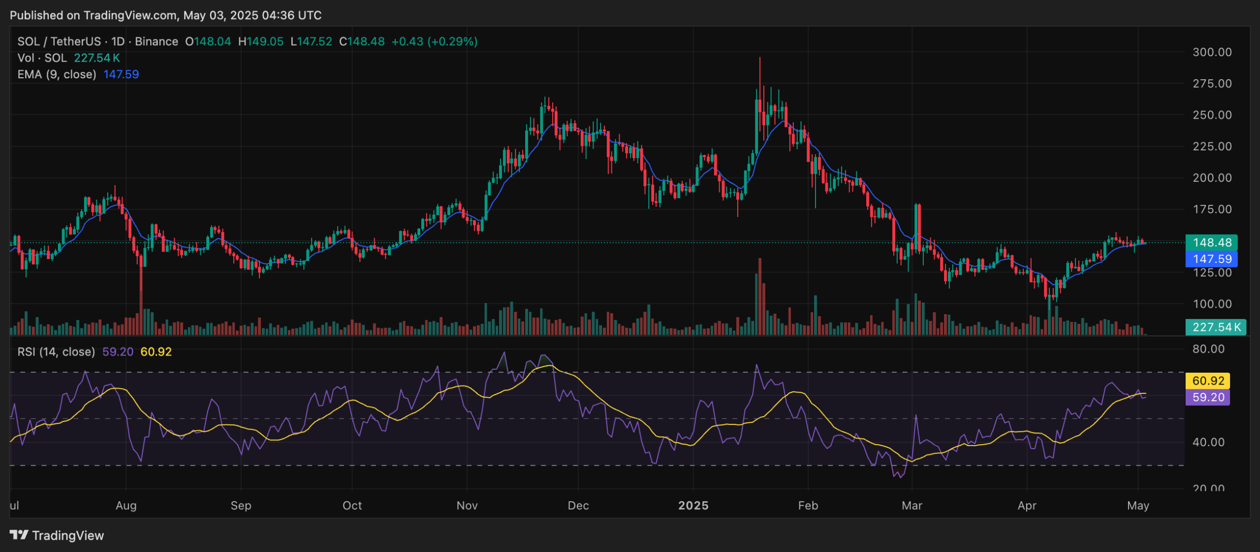 Meski demikian, pada saat laporan ini ditulis, 3 Mei 2025, SOL diperdagangkan di level $148, terkoreksi 1,4% dalam 24 jam terakhir. Level ini merupakan zona resistance penting.