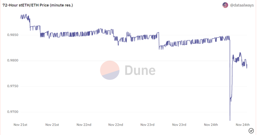 Menurut data Dune Analytic, setelah penarikan dilakukan, harga stETH anjlok hingga 0,9671 ETH. StETH seharusnya berpatok 1:1 dengan ETH dan pergerakan harganya tergantung pada penawaran dan permintaan pasar.